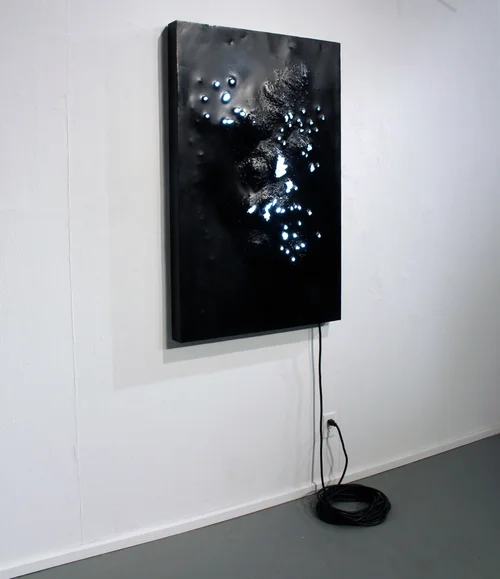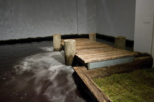 Lagoon is a project that is about the transformation of space when bringing the outside world inside. This work takes a normal gallery and transforms it into a dark-watered lagoon. The viewers are invited to take off their shoes and navigate the dark waters. Cold fog rolls out slowly from underneath the dock. As the viewer wades through the water, shimmering reflections cast onto the surrounding gallery walls.