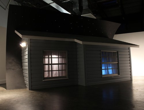 "For Sale or Lease" explores the viewer's sense of belonging through an interactive sculpture and photographic installation. The full-scale facade of a suburban house bisects the gallery, approachable and familiar in appearance yet closed-off and protected from the viewer. It is a house that invites yet guards, nurturing inside yet securing from the outside. In "For Sale or Lease," the viewer toes the line between public and private property. They approach, peer, linger, and in the end, wonder: are they looking inside....or out?